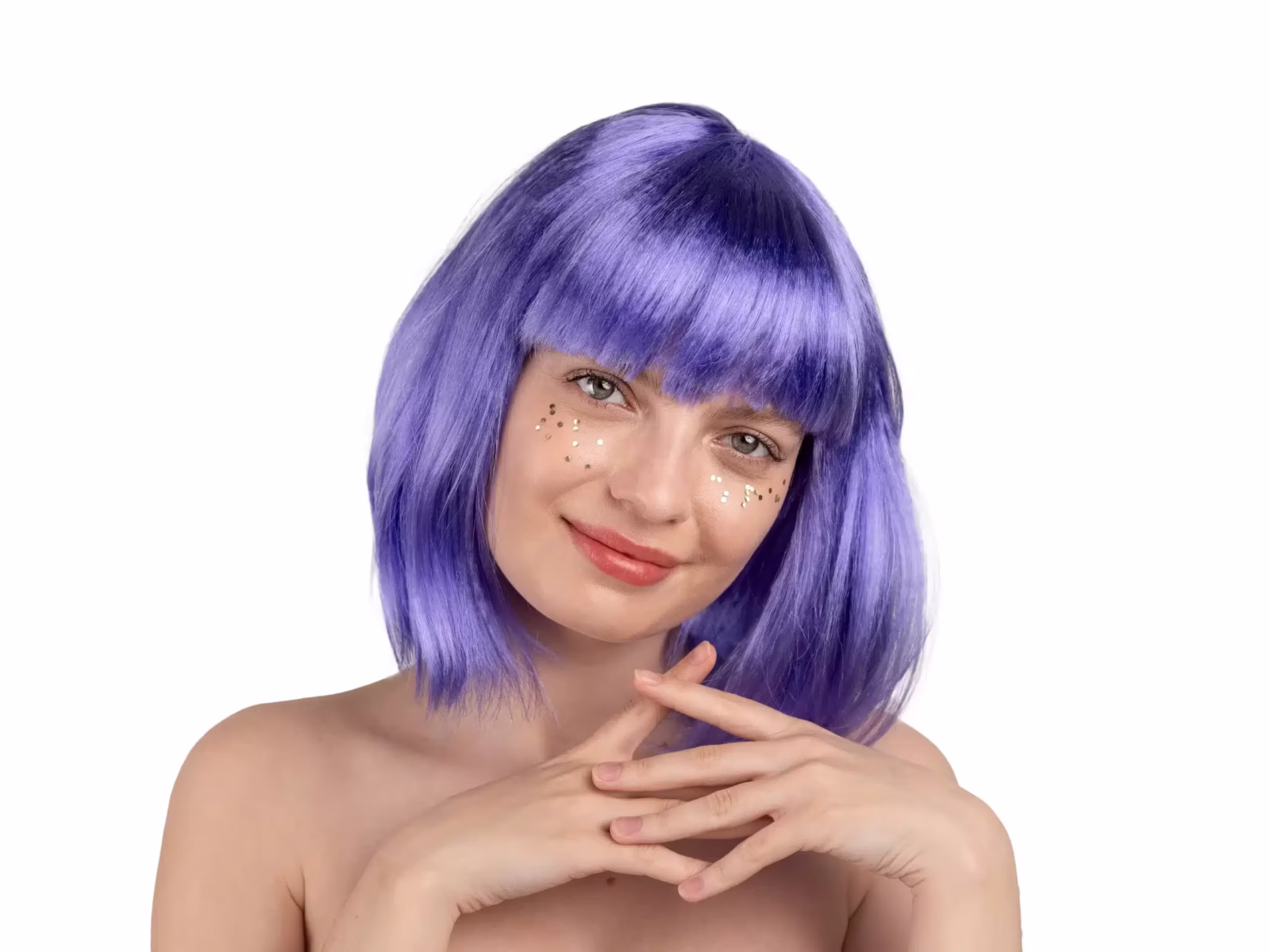 Cleopatra style wig, shoulder-length purple hair